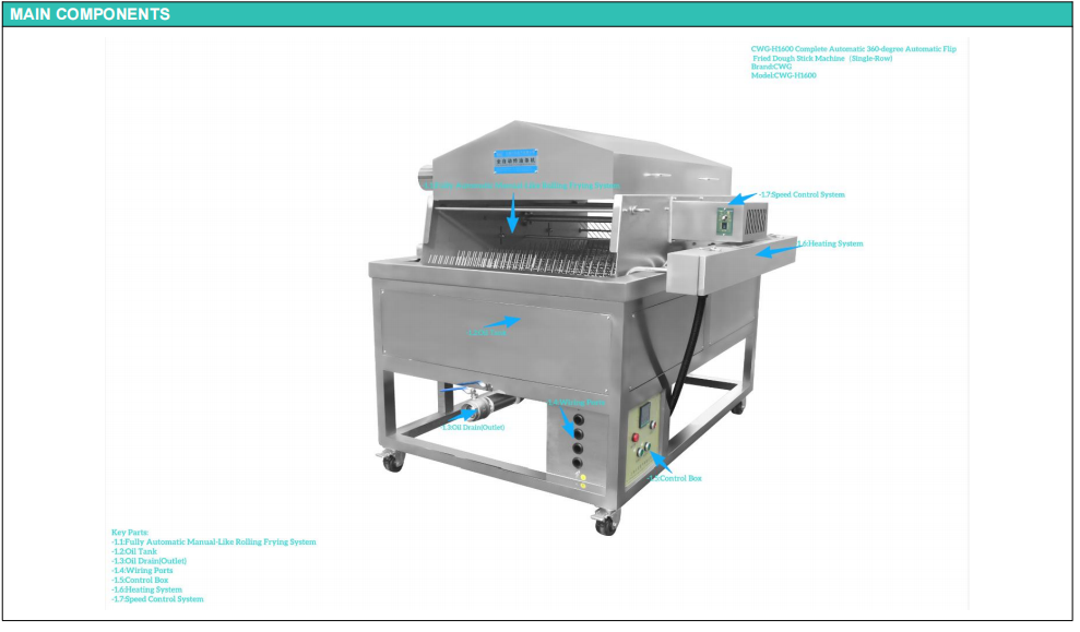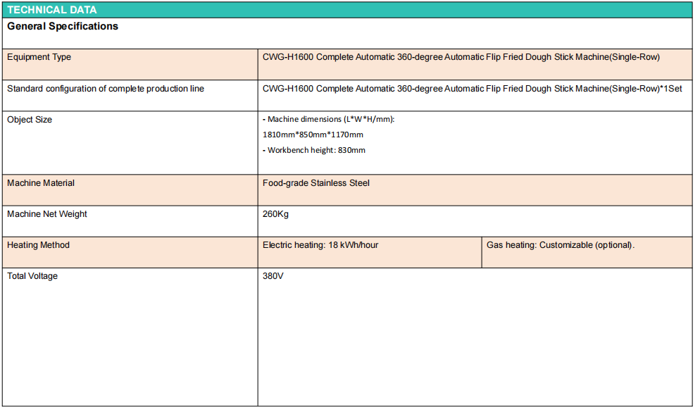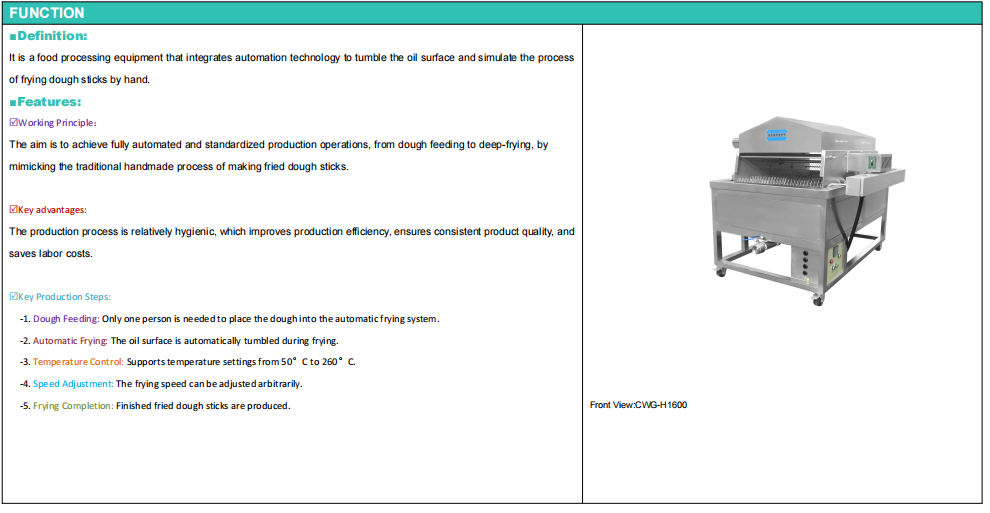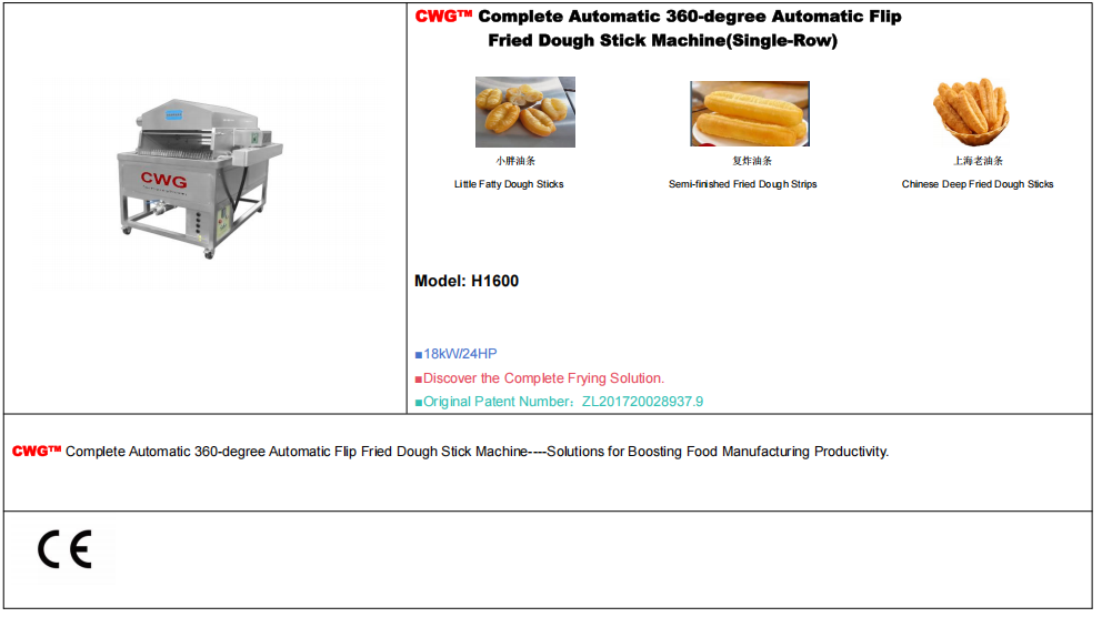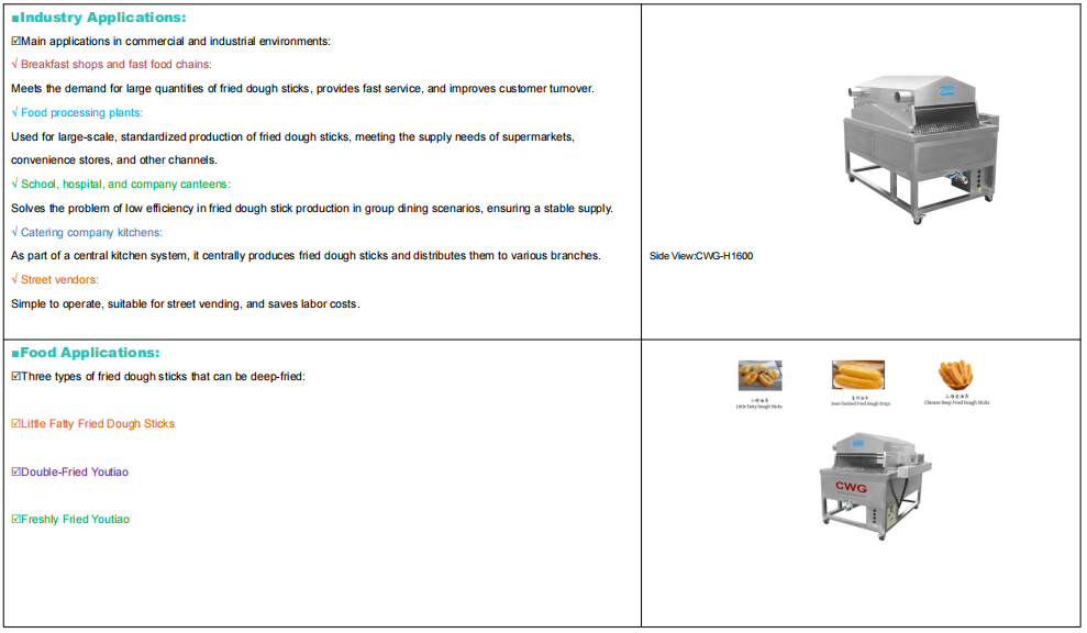 CWG 260Kg Fully automatic Stainless Steel Imitation Handmade Fried Dough Stick Machine-Solutions for Boosting Food Manufacturing Productivity, primarily used in commercial and industrial environments: breakfast shops and fast food chains, food processing plants, schools, hospitals, company canteens, restaurant kitchens, street vendors. Capable of frying small, double-fried dough sticks, and freshly fried dough sticks. 380V 28kW fully automatic commercial professional fried dough stick machine.