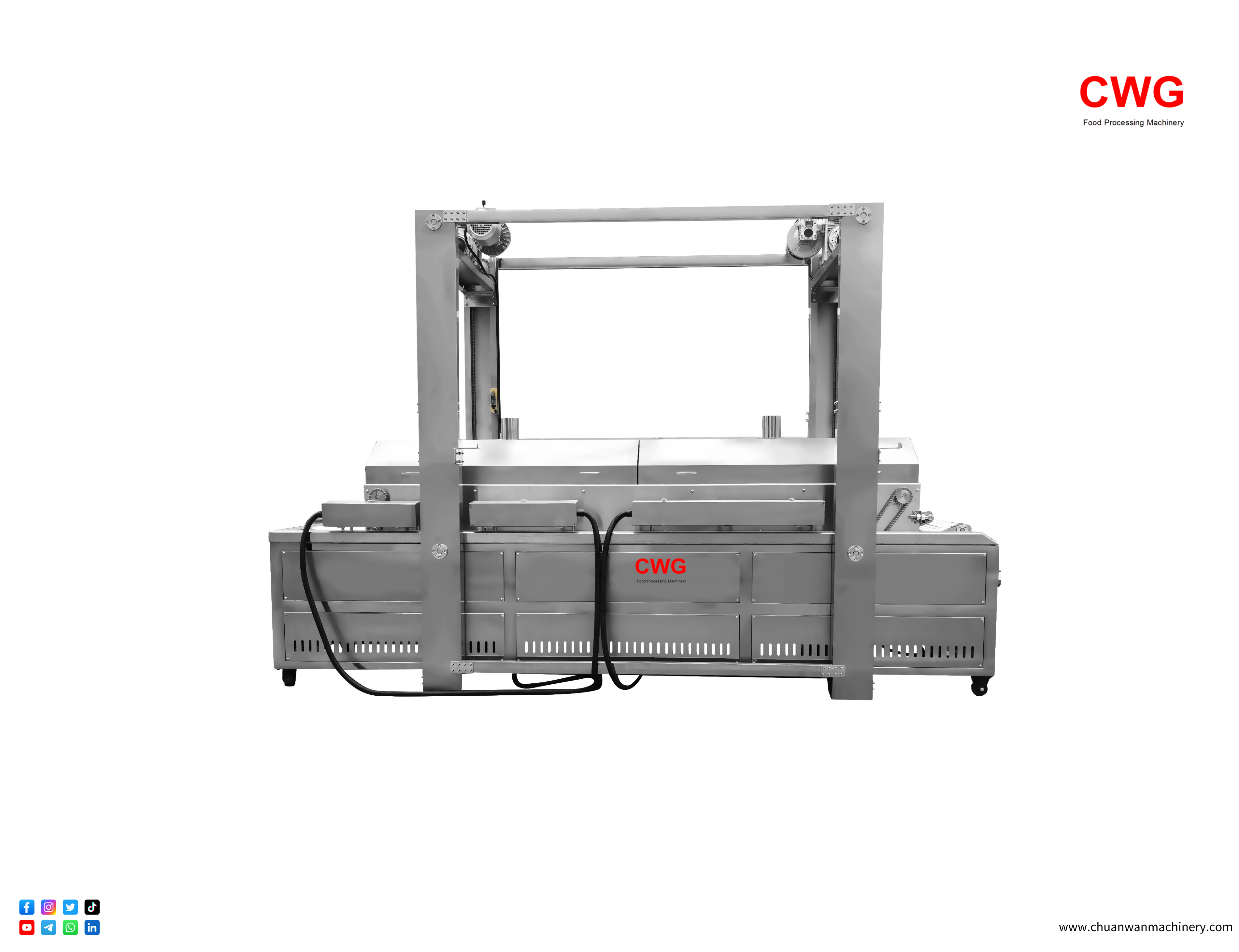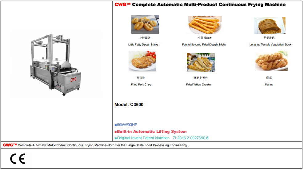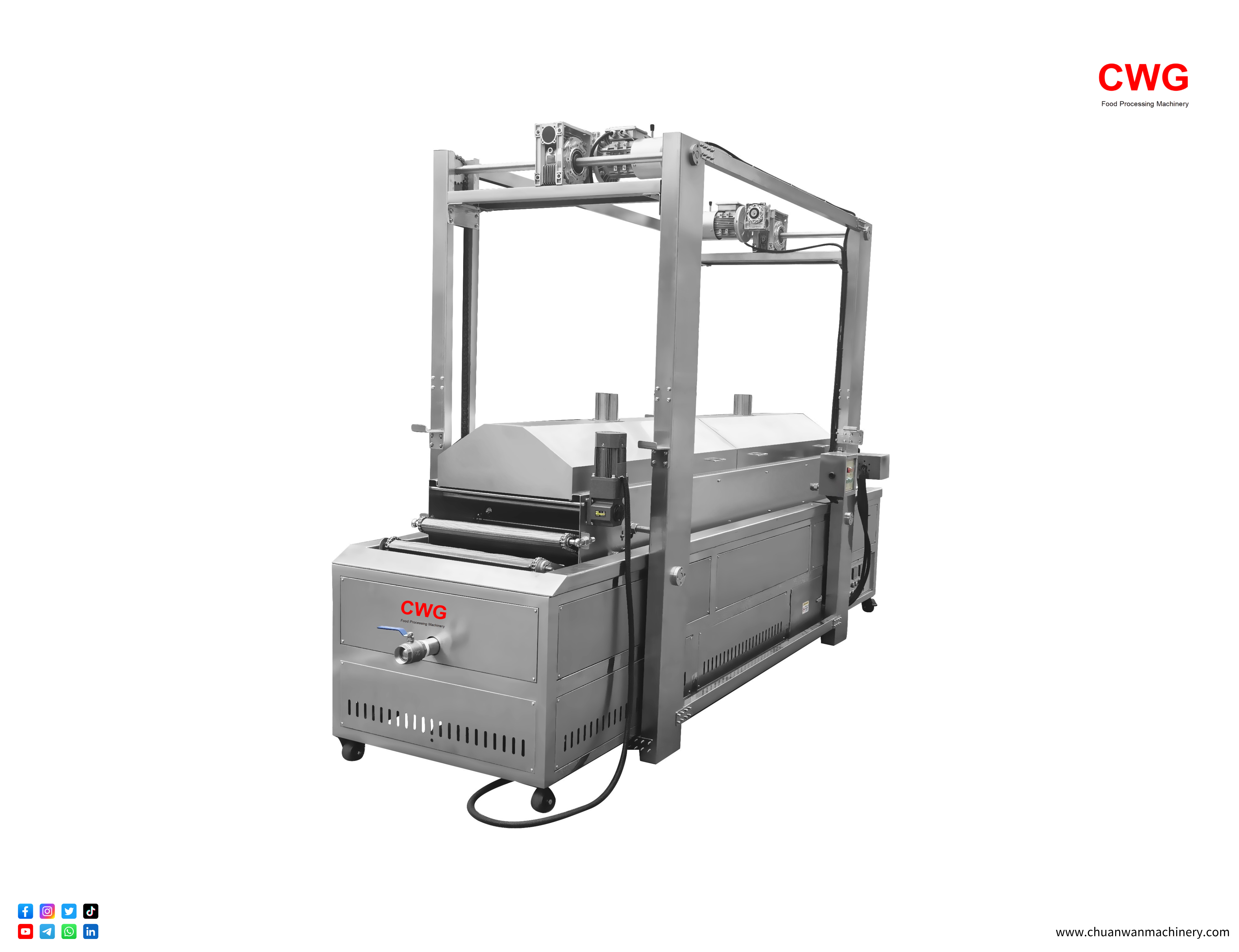 CWG 700Jin Fully Automatic Multi-Product Continuous Frying Machine,Green and Energy-Saving, Precise Temperature Control, with Automatic Lifting System, can be heated by electricity or gas, and can fry various fried foods: flour products, bean products, fish, meat, and vegetables. Suitable for restaurant chains and central kitchens, frozen food industry, agricultural product processing, aquatic product processing, pastry baking and other food processing industries. 380V 69kW commercial frying solution.