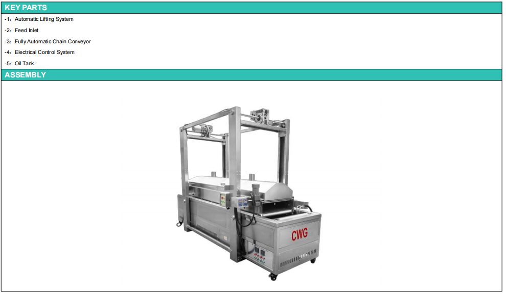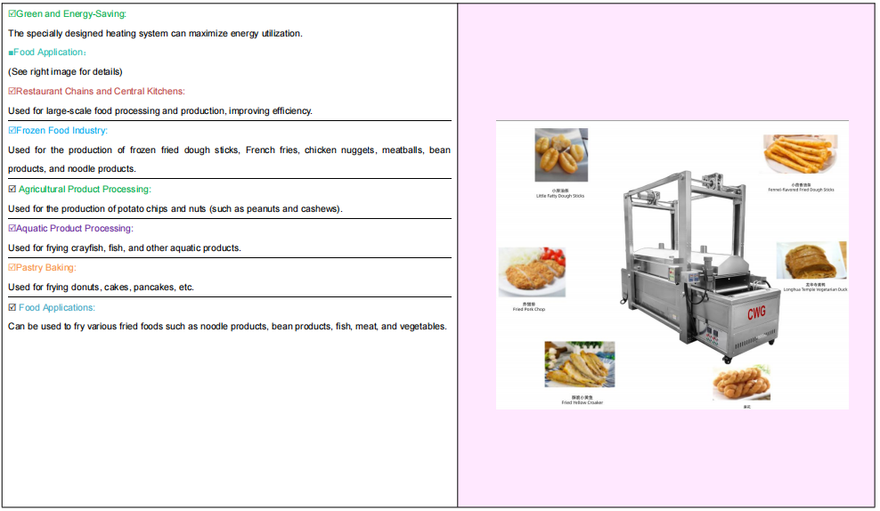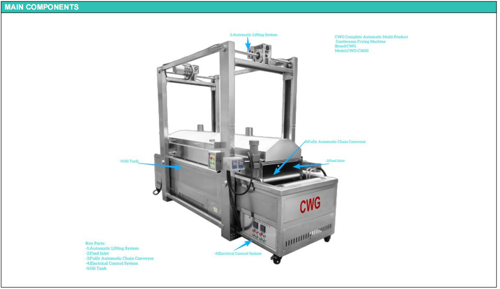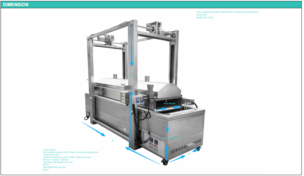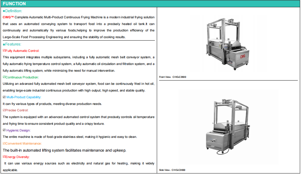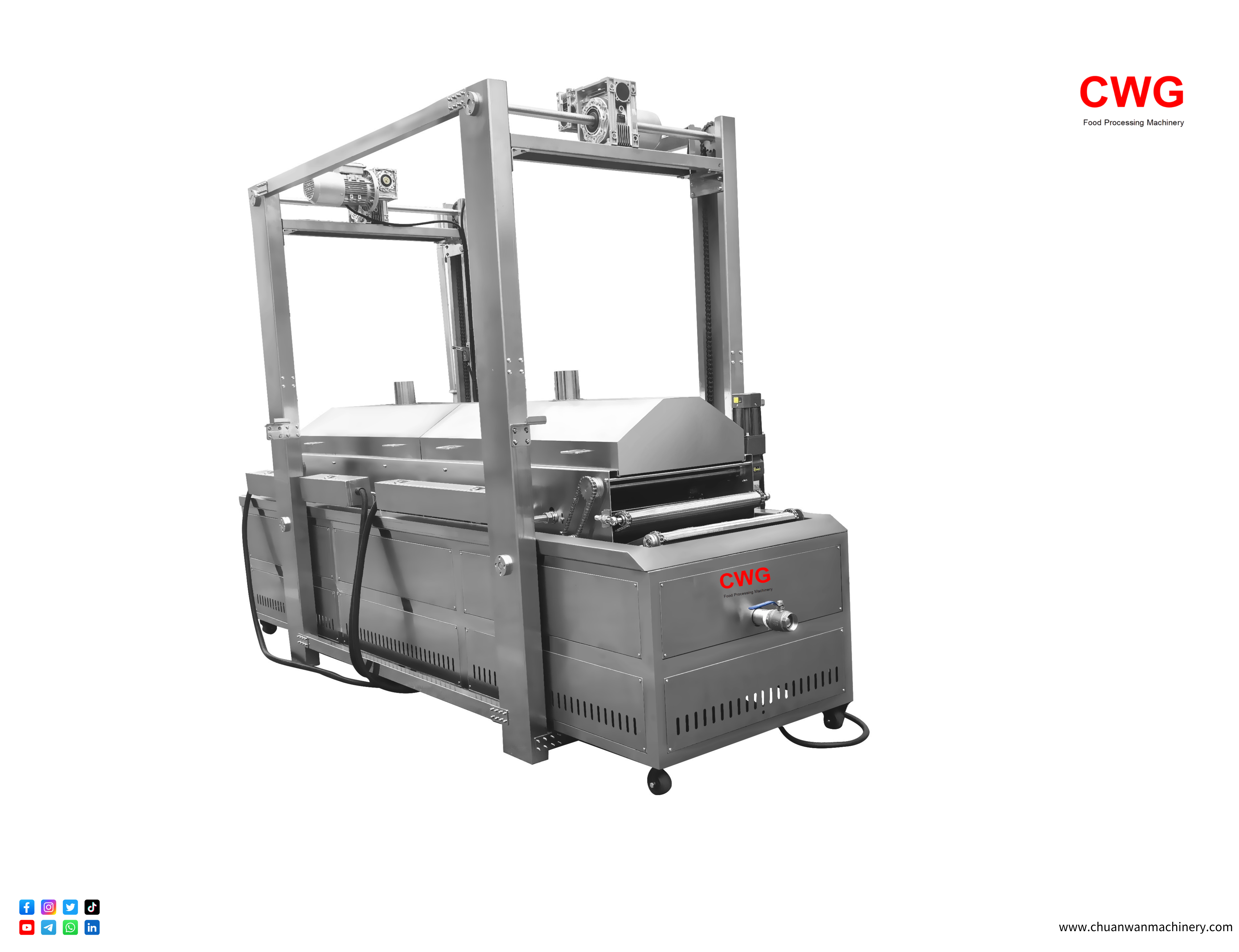 CWG 700Jin Fully Automatic Multi-Product Continuous Frying Machine,Green and Energy-Saving, Precise Temperature Control, with Automatic Lifting System, can be heated by electricity or gas, and can fry various fried foods: flour products, bean products, fish, meat, and vegetables. Suitable for restaurant chains and central kitchens, frozen food industry, agricultural product processing, aquatic product processing, pastry baking and other food processing industries. 380V 69kW commercial frying solution.